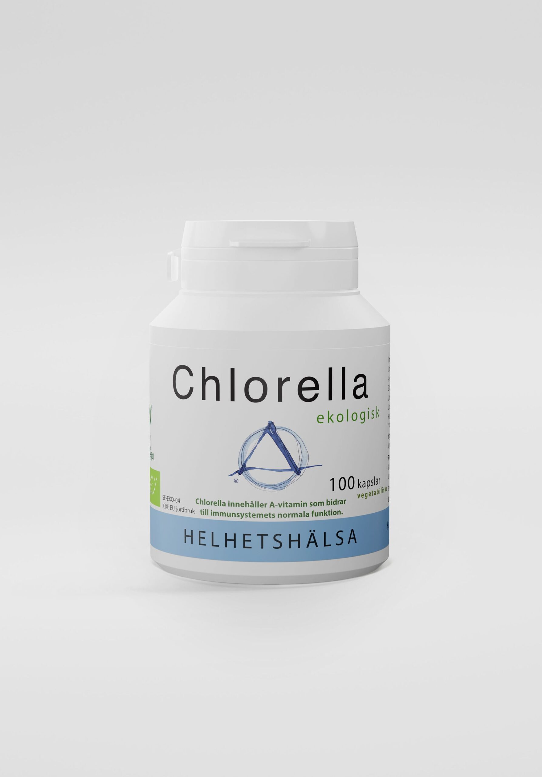 Ekologisk chlorella från Helhetshälsa med krossade cellväggar för optimalt upptag. Algerna odlas i bassänger med noggrant kontrollerat och rent vatten, vilket är avgörande eftersom alger som växer i förorenade miljöer kan ta upp tungmetaller.