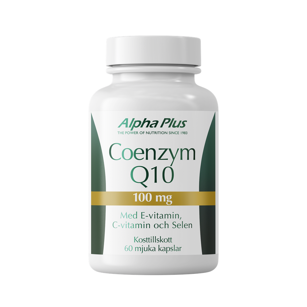 Alpha Plus Coenzym Q10 100 mg innehåller Q10 med E-vitamin, C- vitamin och selen. Antioxidanten Q10 finns naturligt i kroppens egna celler. Vitamin C bidrar till att minska trötthet och utmattning. E-vitamin och selen bidrar till att skydda cellerna mot oxidativ stress. Selen bidrar till immunsystemets normala funktion.