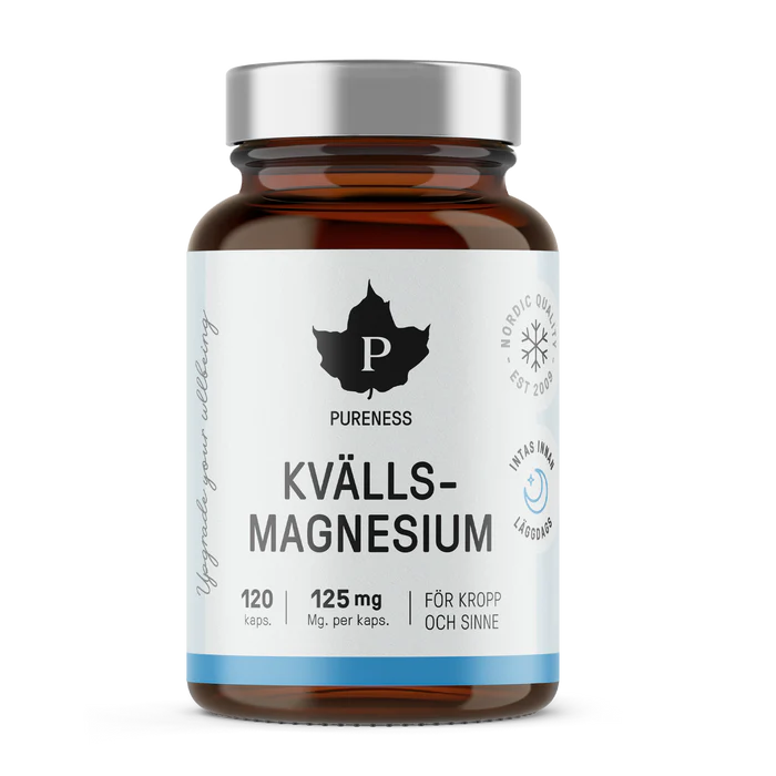 Pureness Kvällsmagnesium är ett kosttillskott med magnesium och noggrant utvalda örtextrakt, utvecklat för att främja avslappning och bidra till en bättre nattsömn. Ett utmärkt val för dig som upplever stress, oro eller sömnsvårigheter.